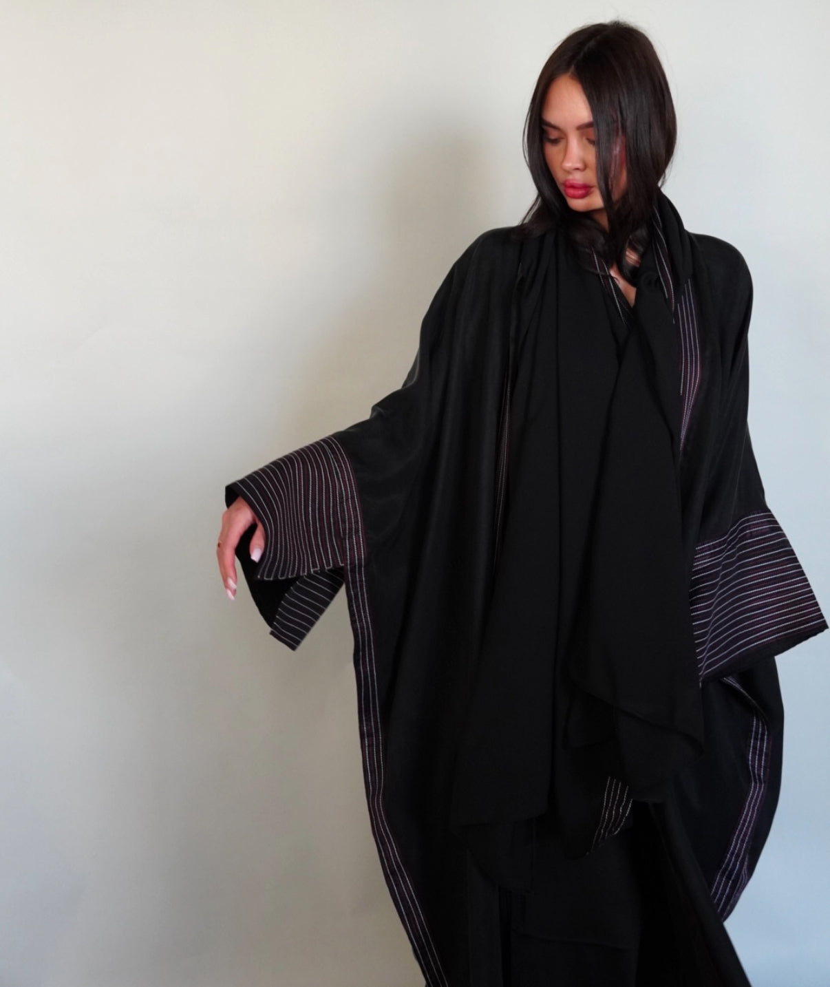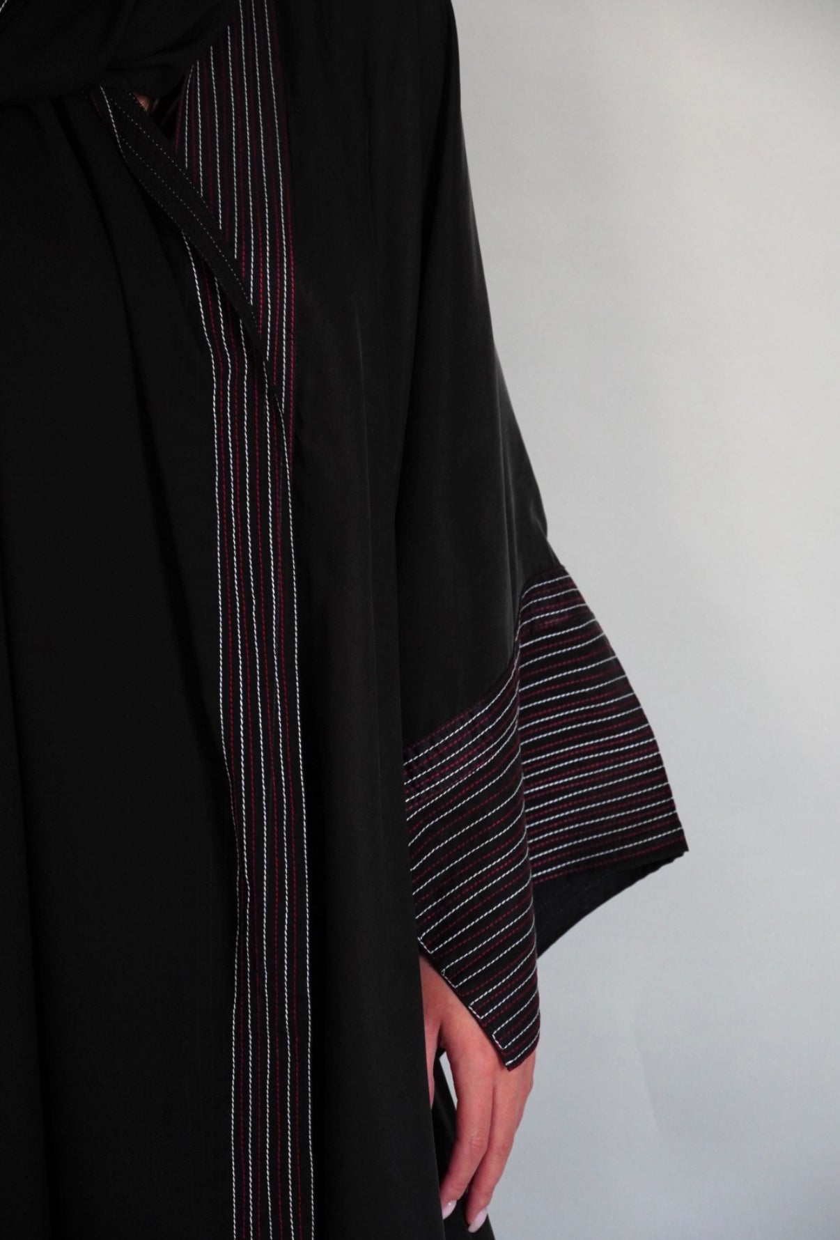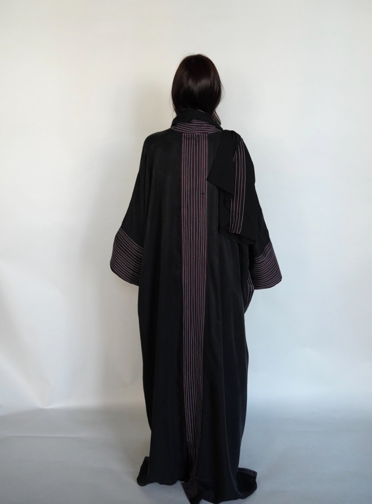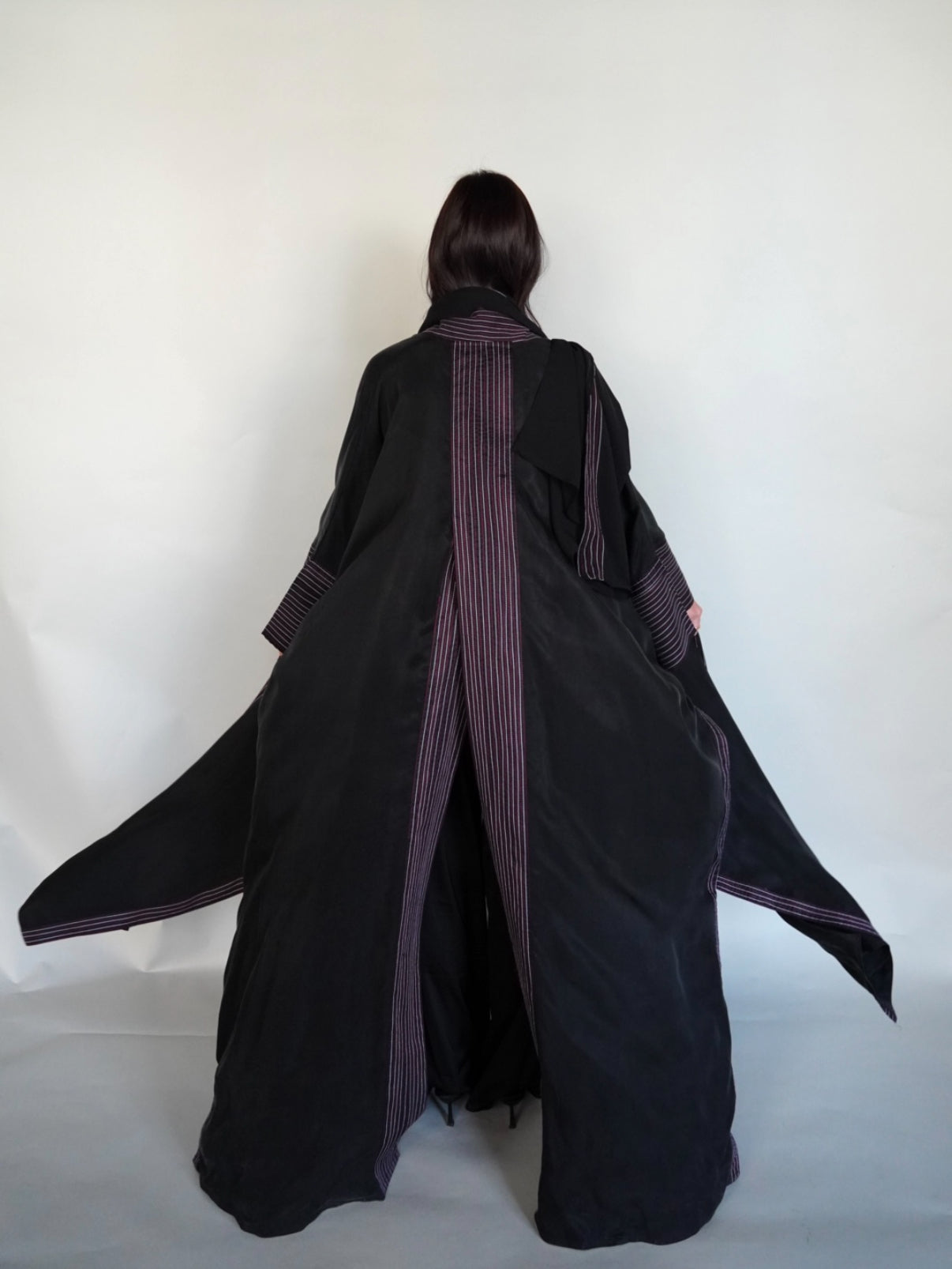 Washed silk with white and red stripes on the side and back, featuring a long opening from the top of the back down to the bottom.