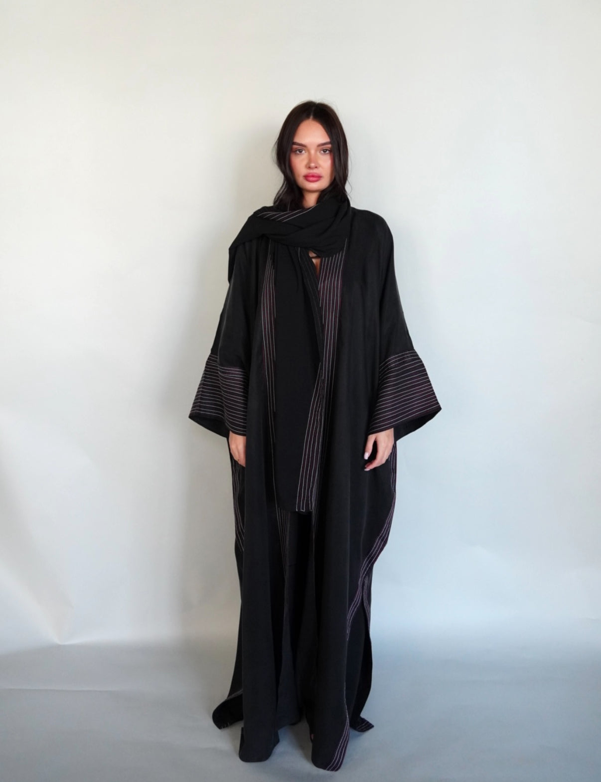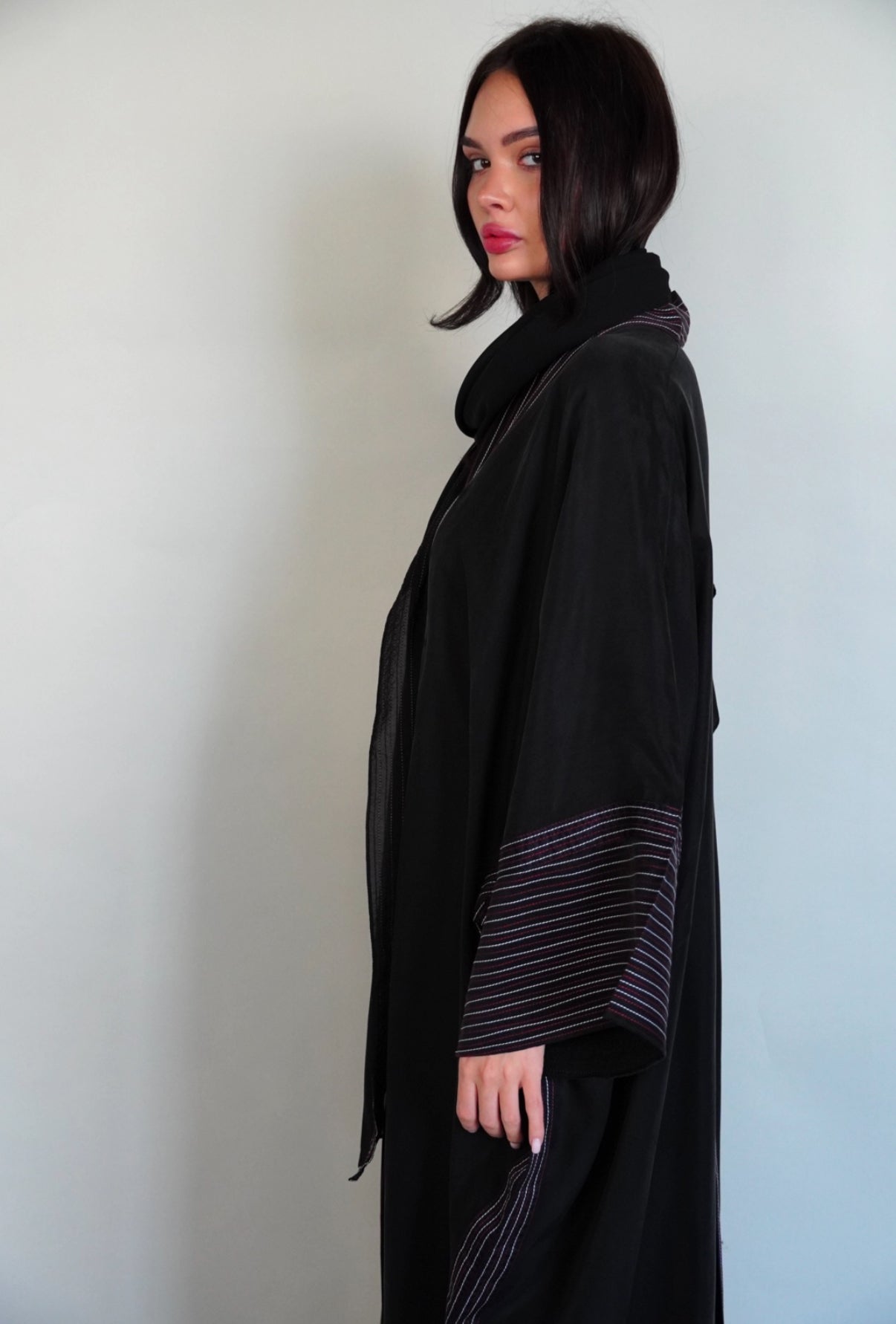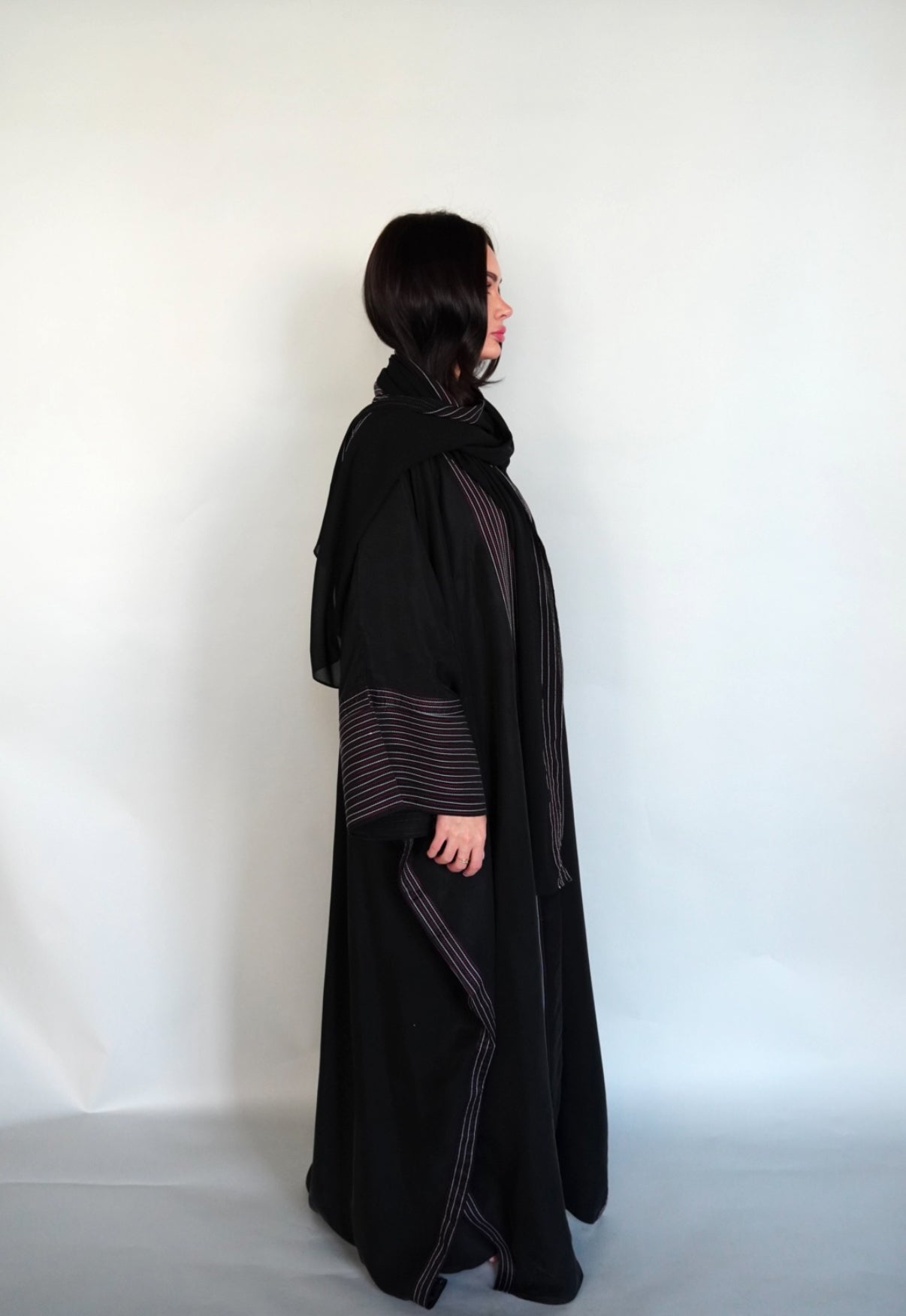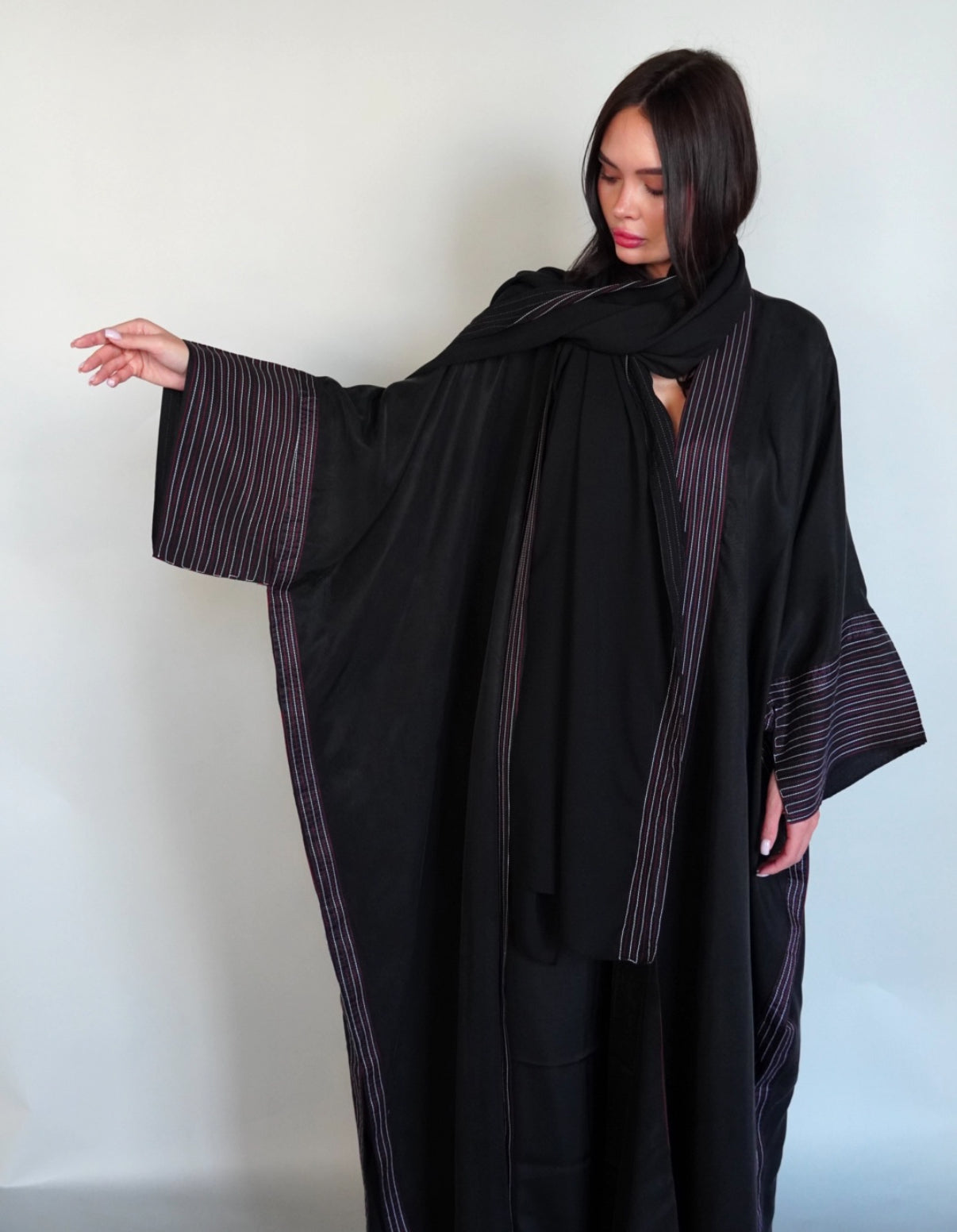 Washed silk with white and red stripes on the side and back, featuring a long opening from the top of the back down to the bottom.