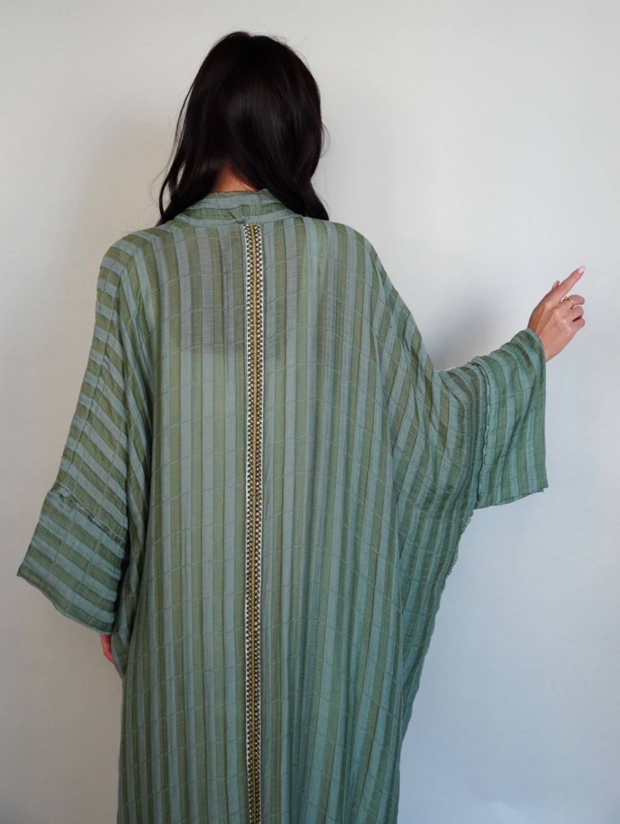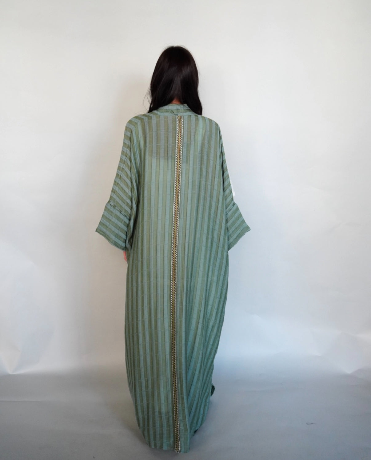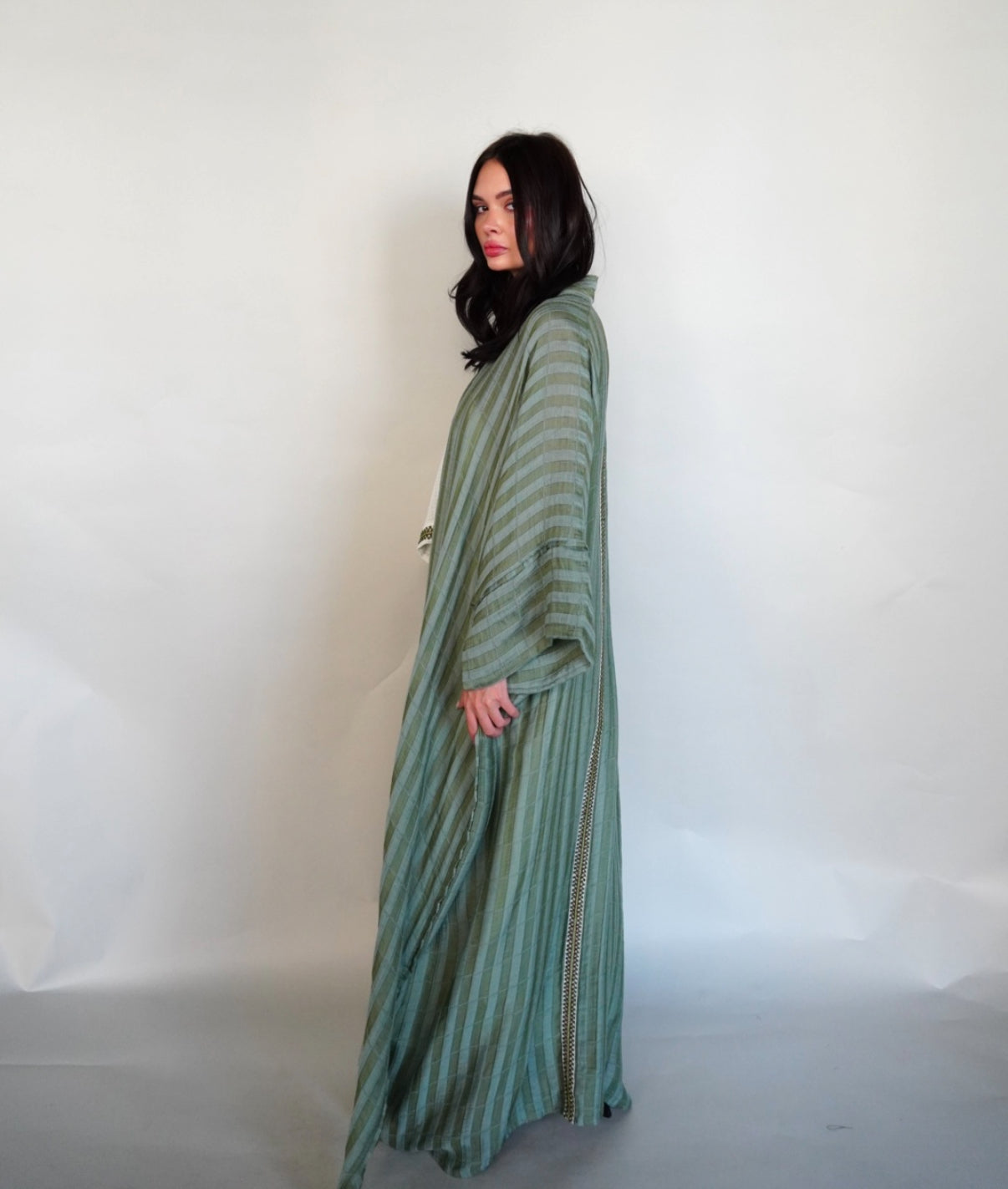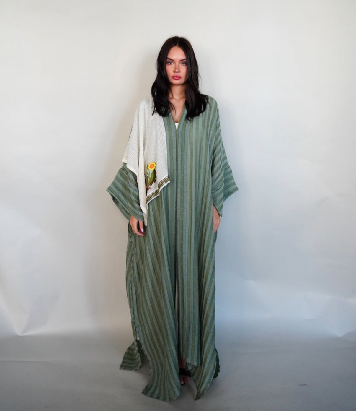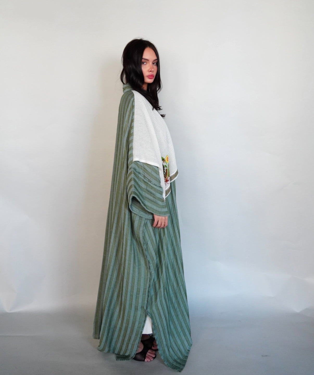 Green tiffany abaya with handcrafted piece on one shoulder.