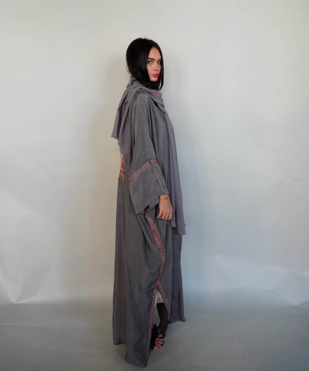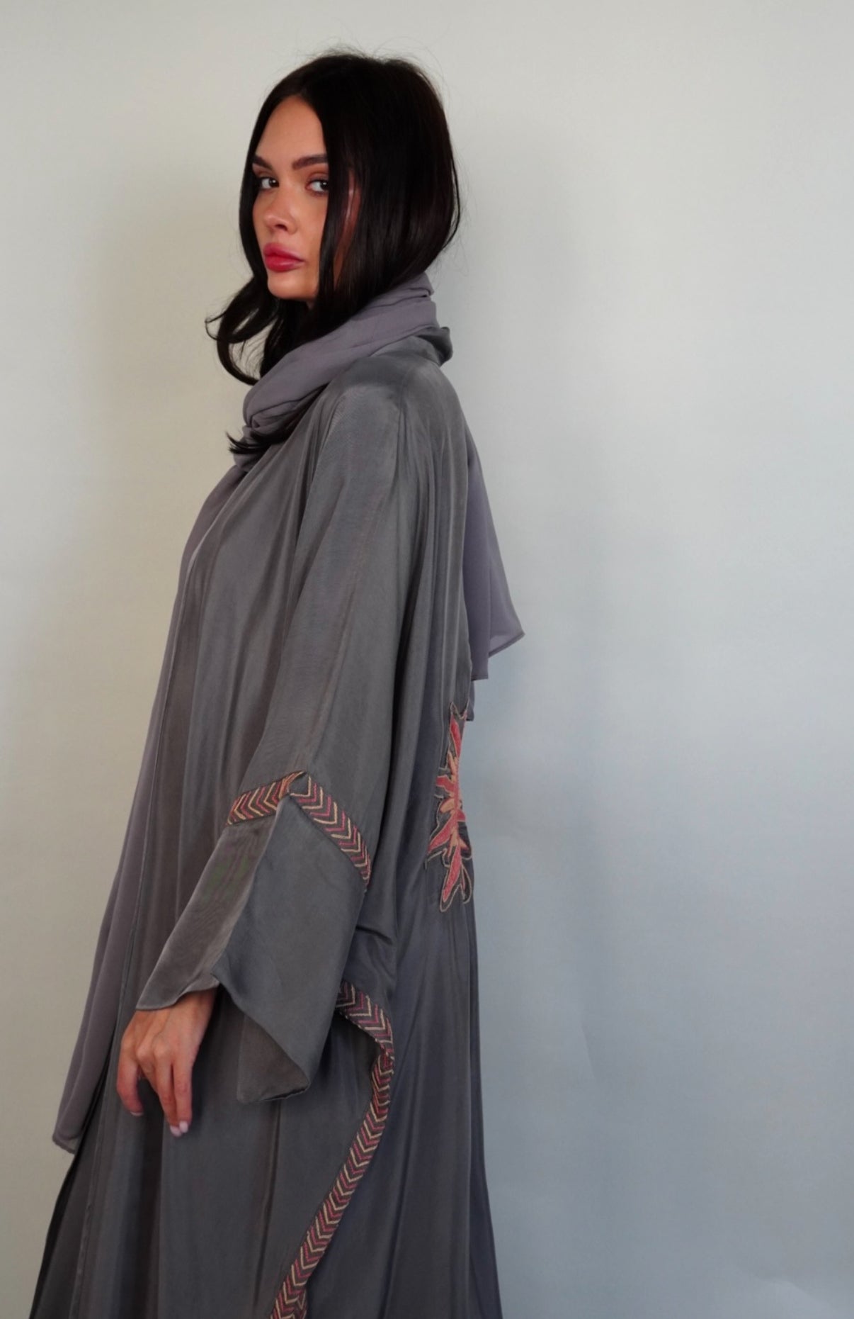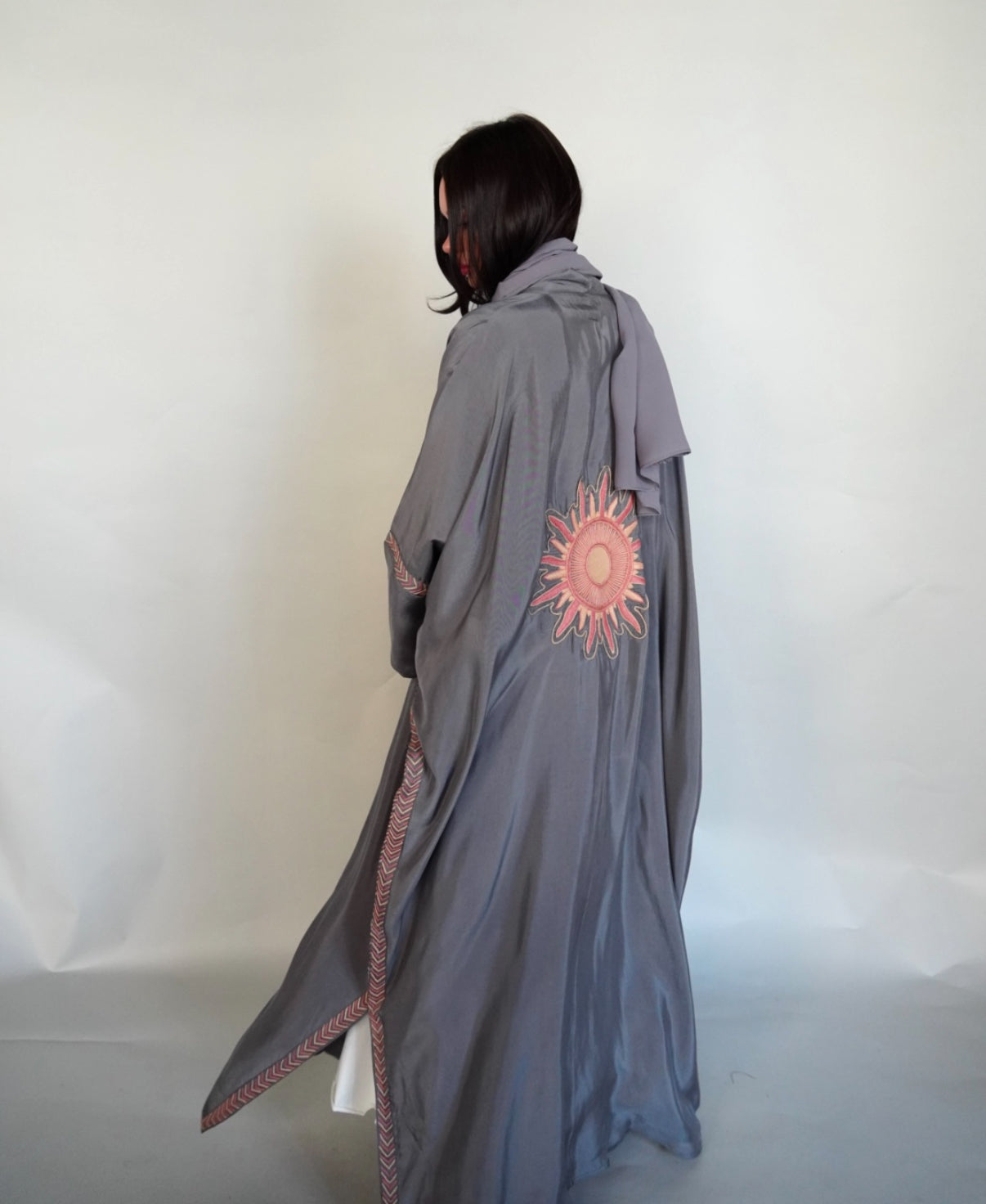 Grey washed silk abaya embroidered in beige and pink .