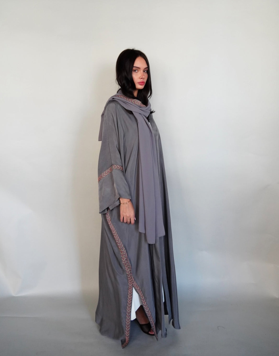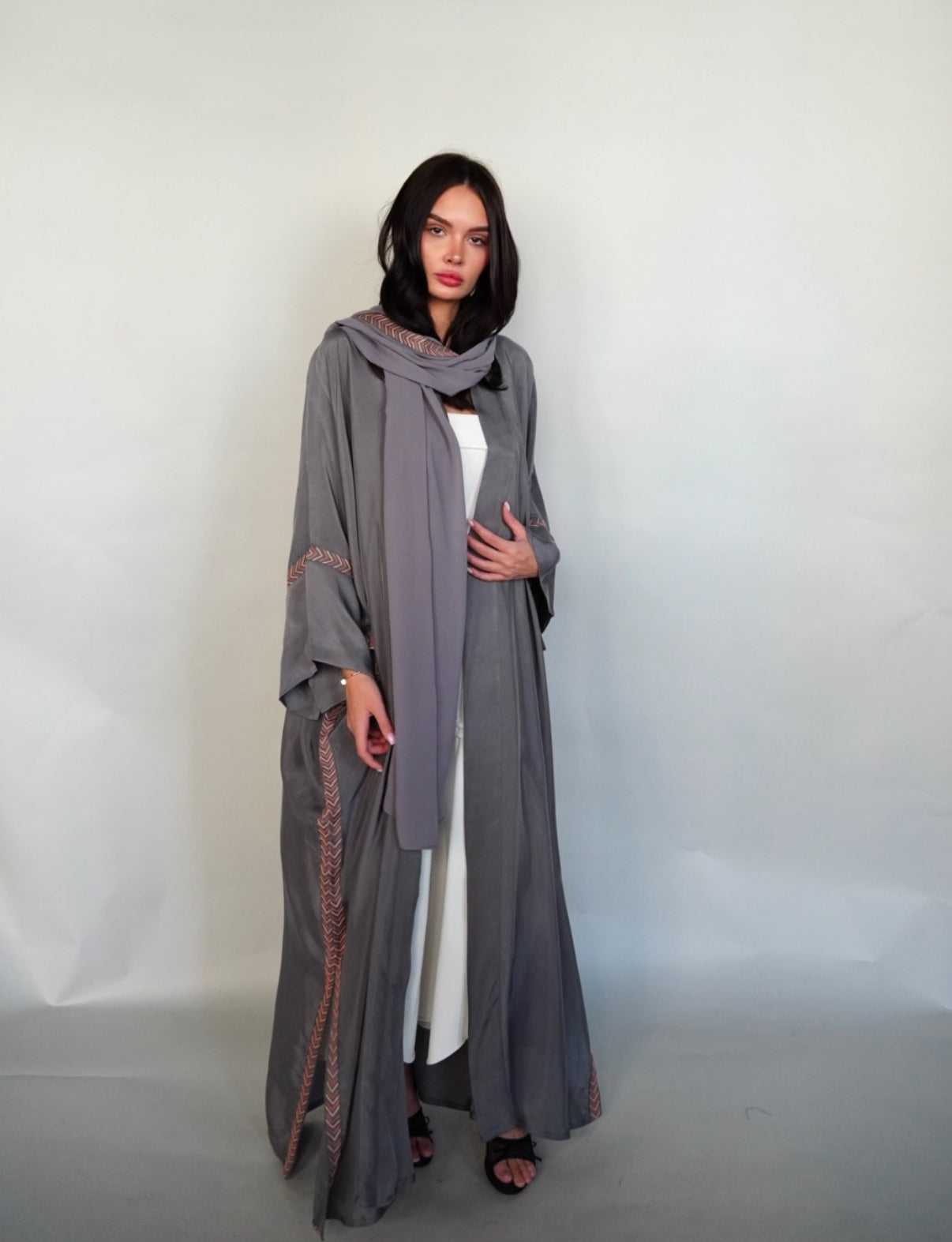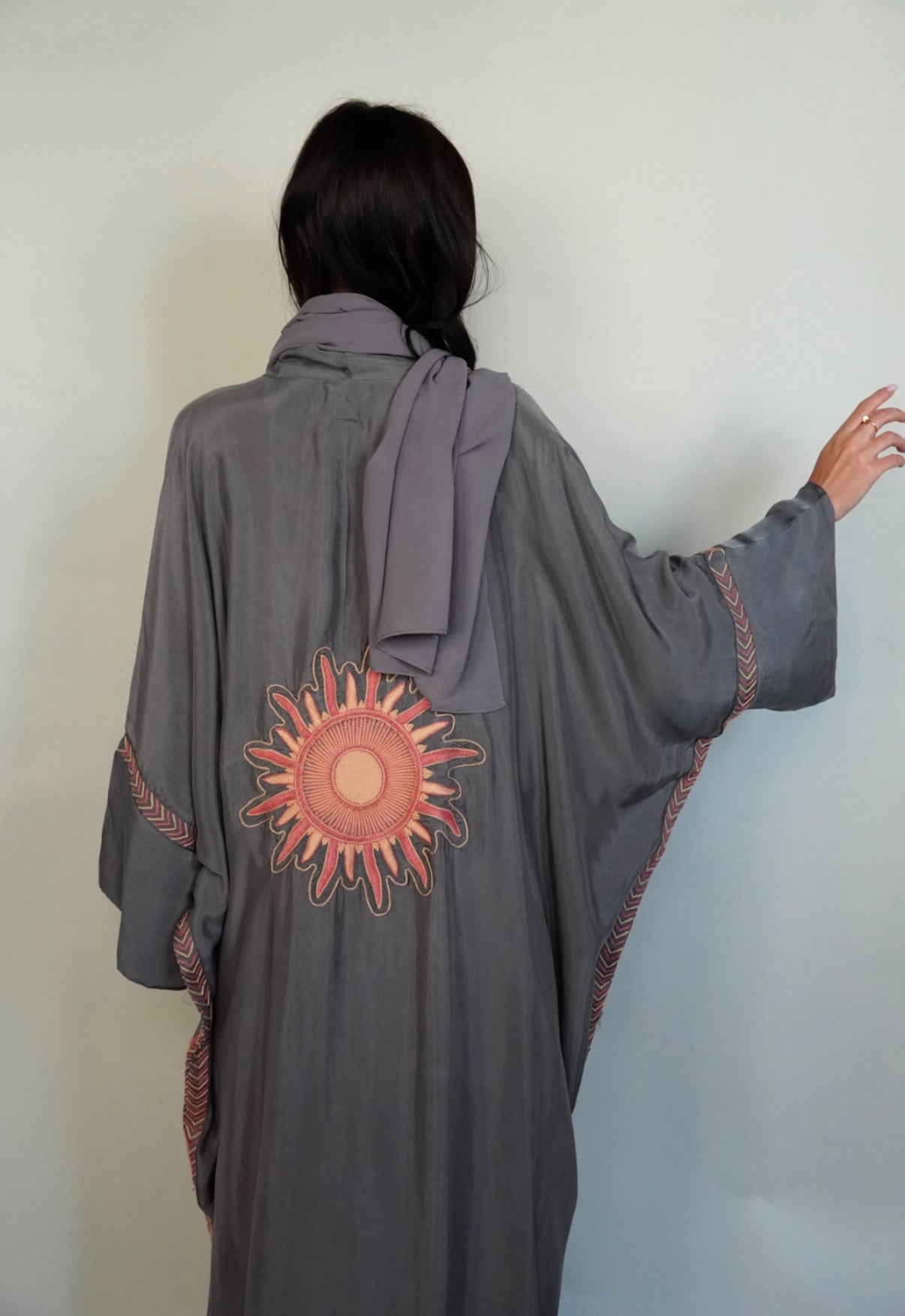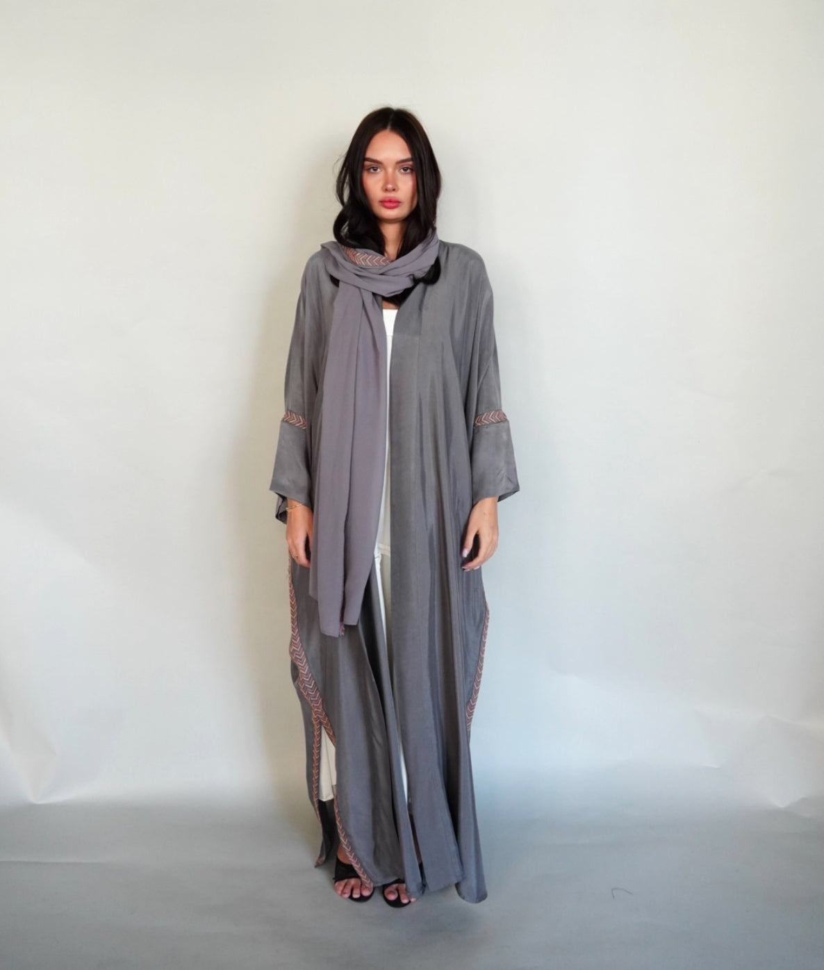 Grey washed silk abaya embroidered in beige and pink .