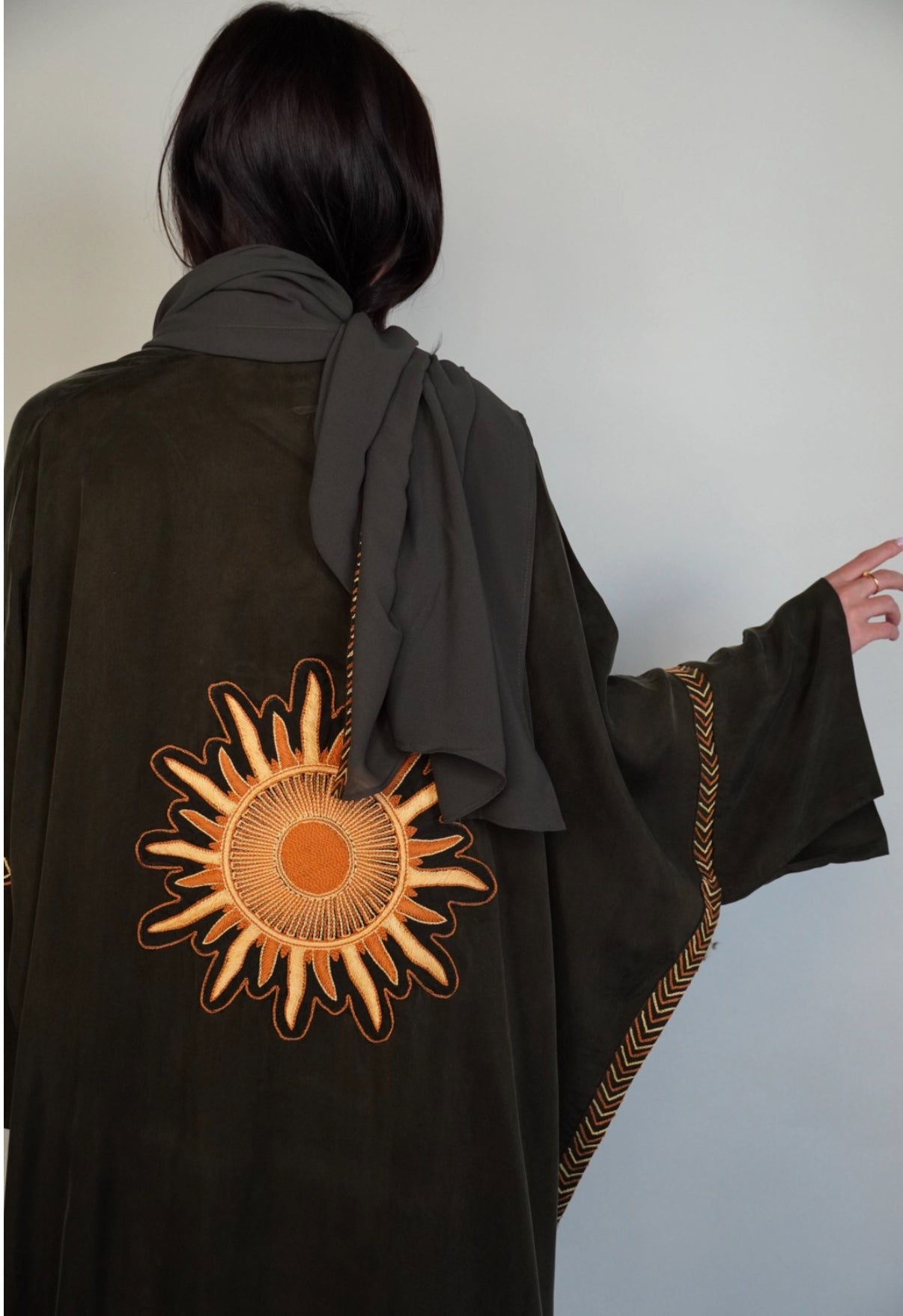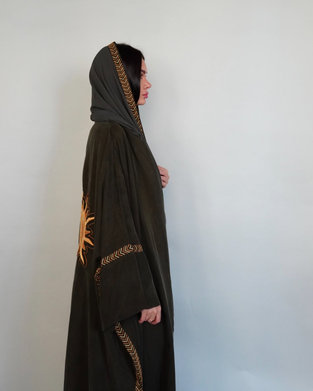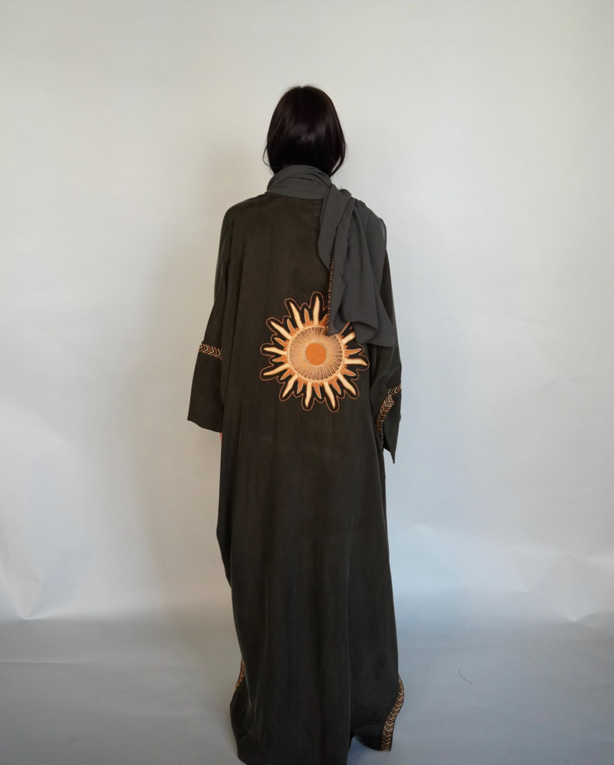 Dark olive green washed silk abaya embroidered in yellow and orange .