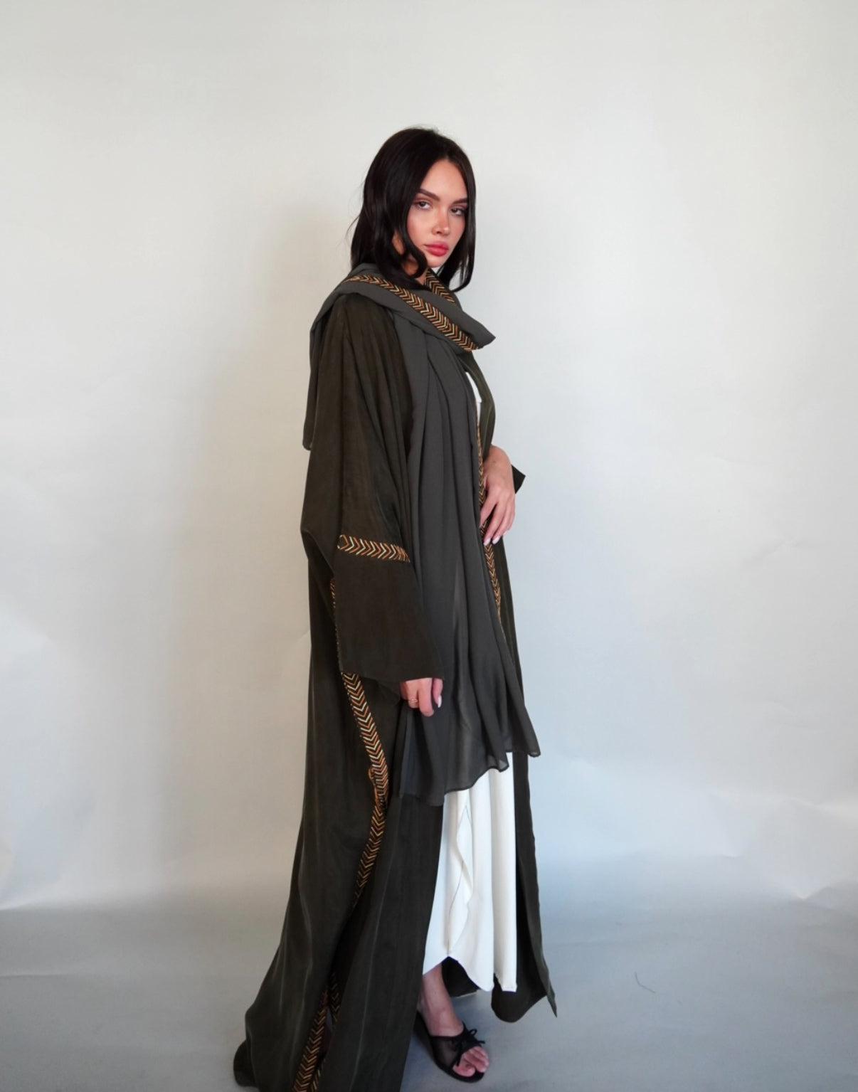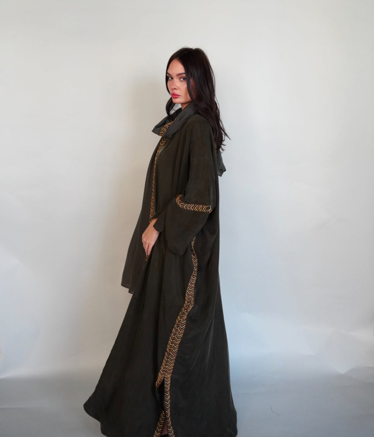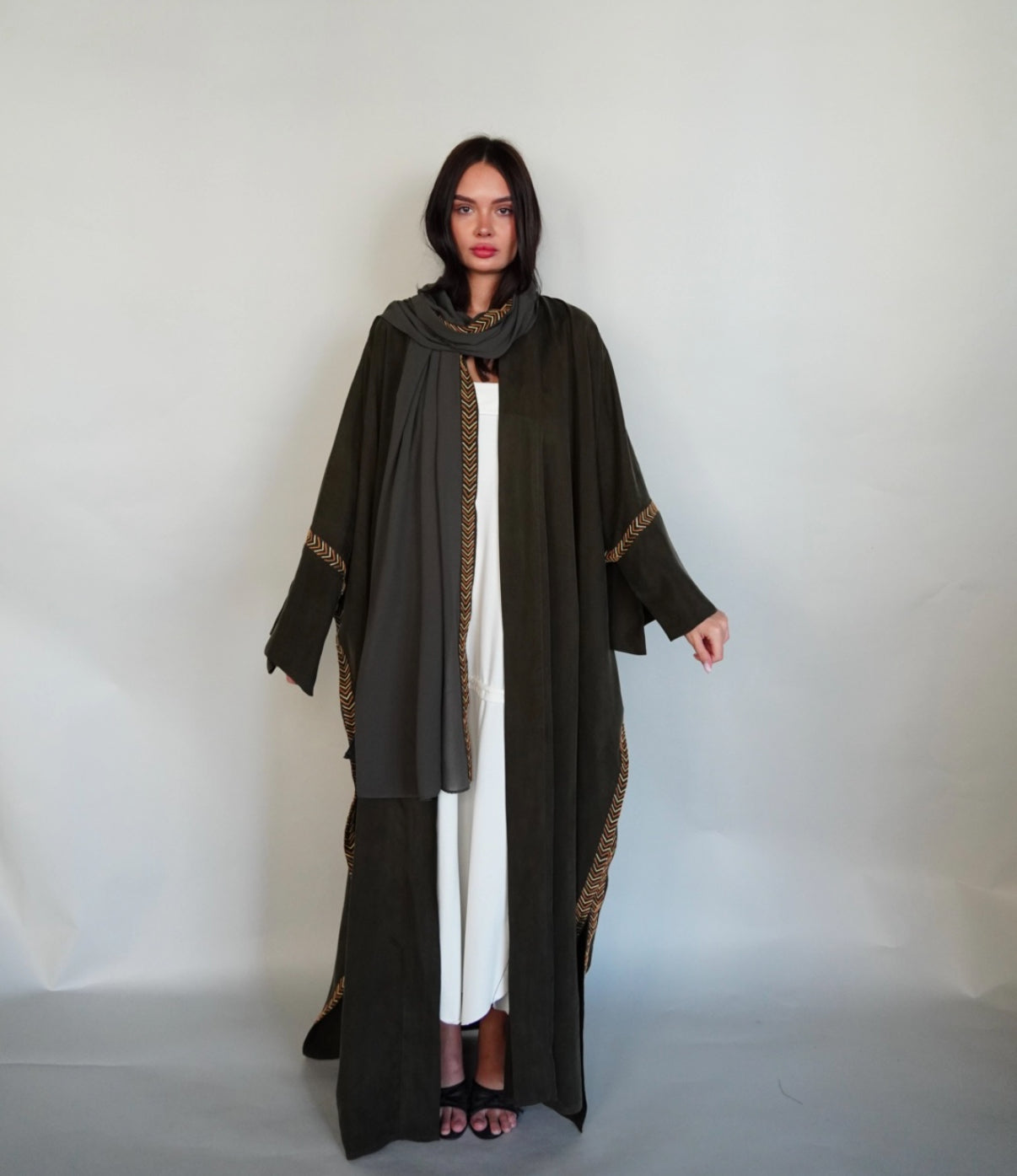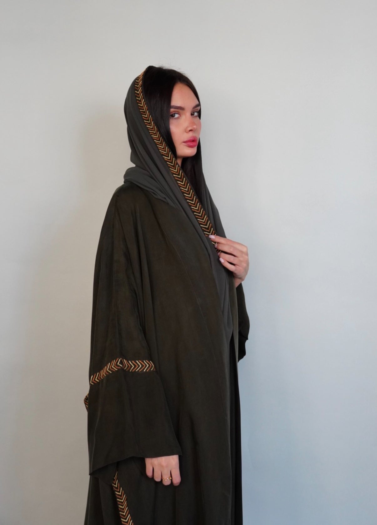 Dark olive green washed silk abaya embroidered in yellow and orange .