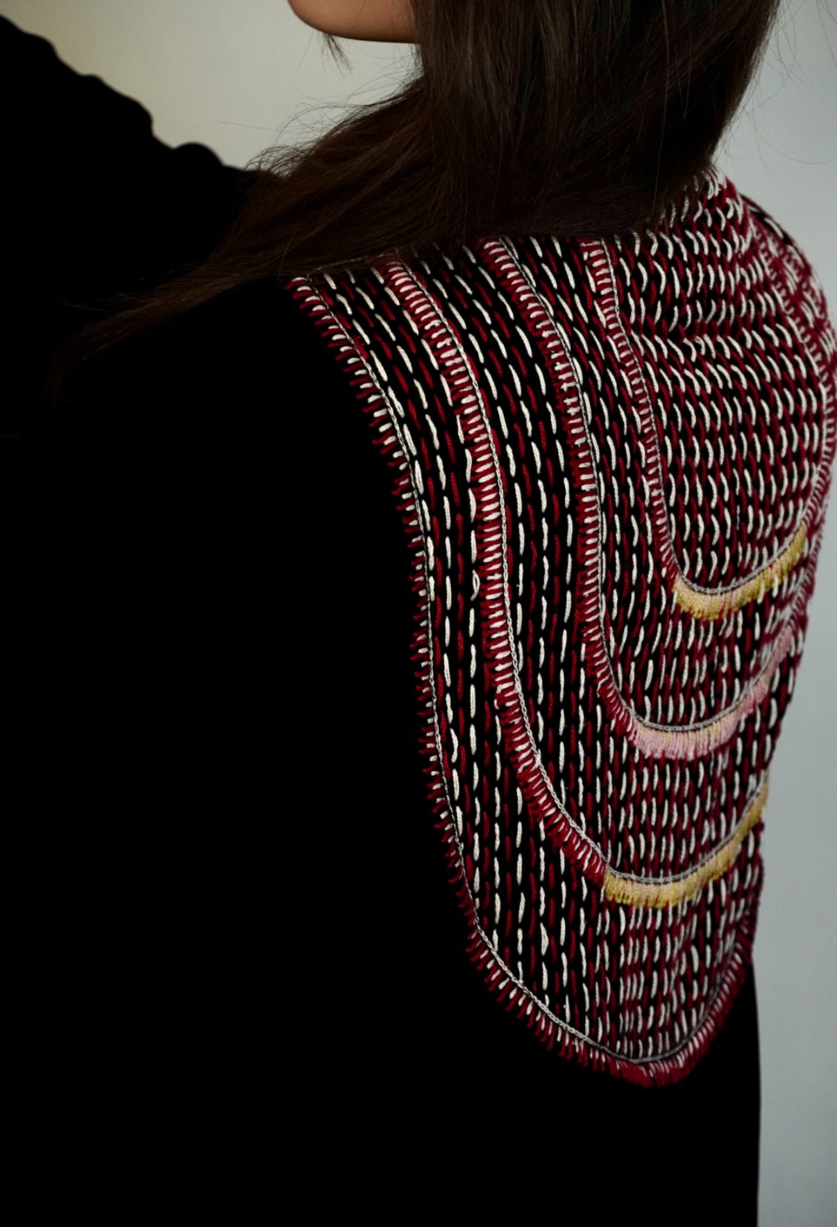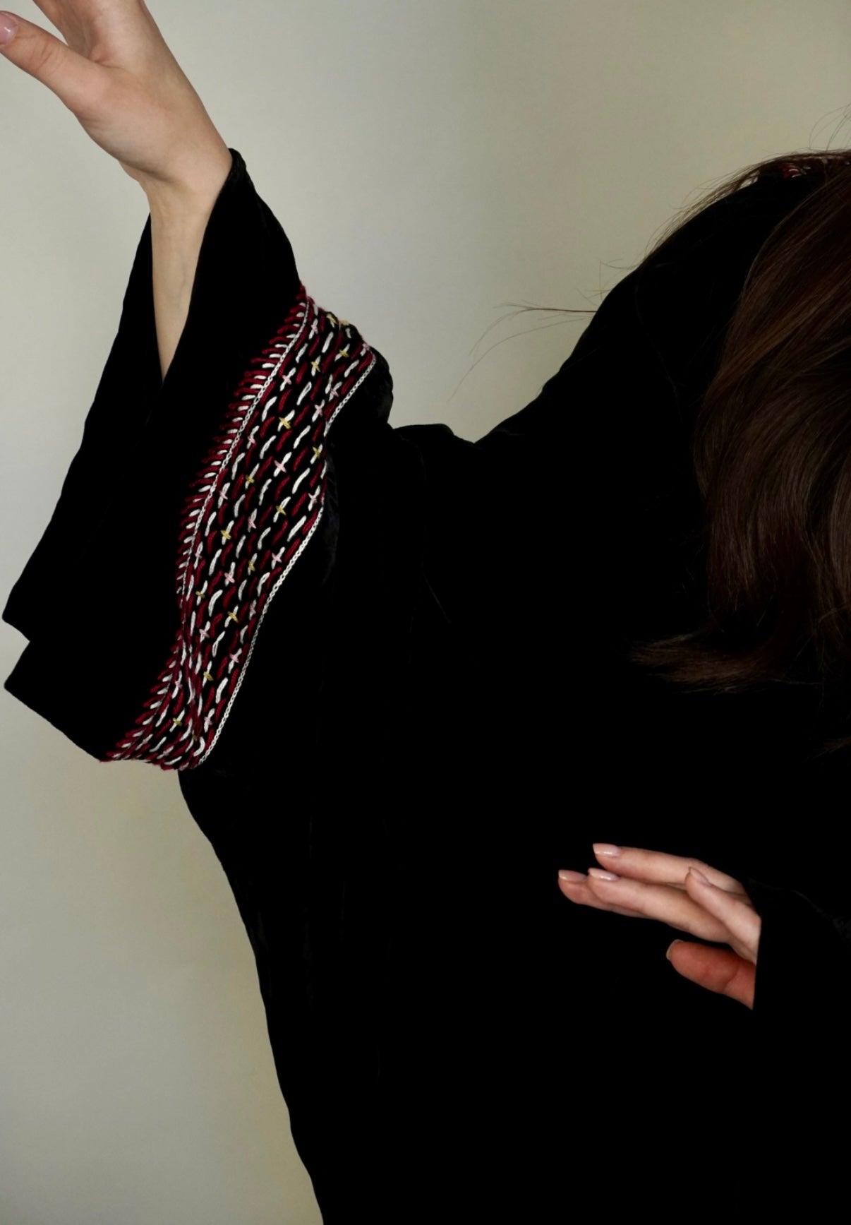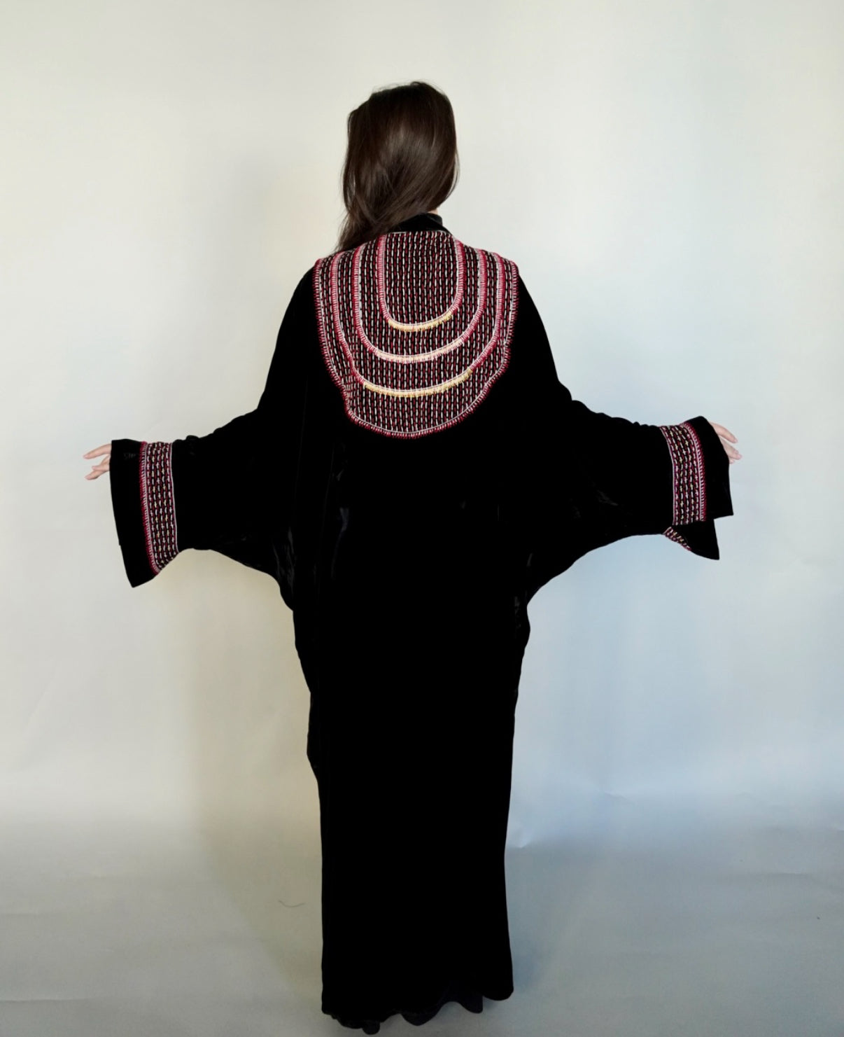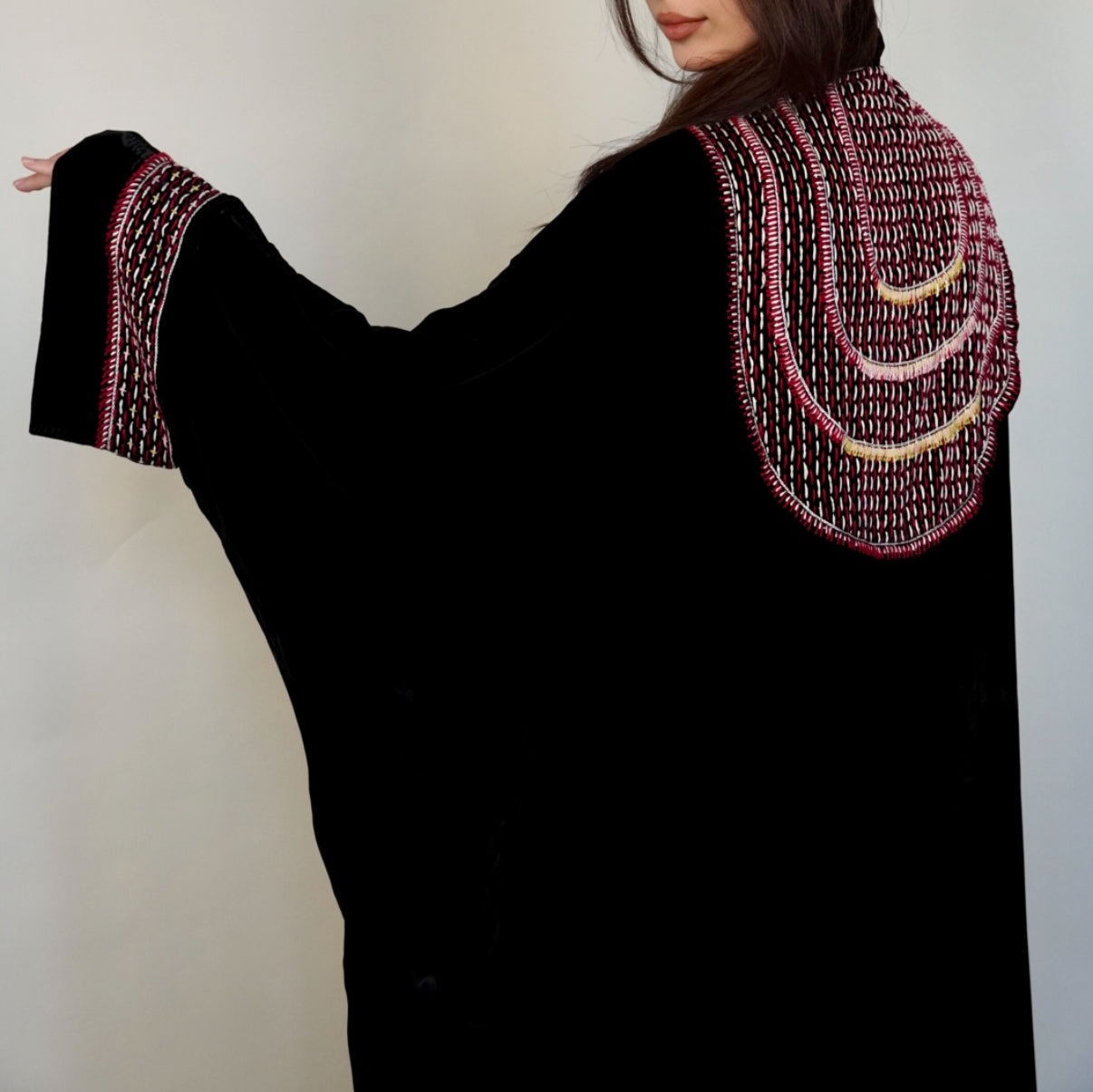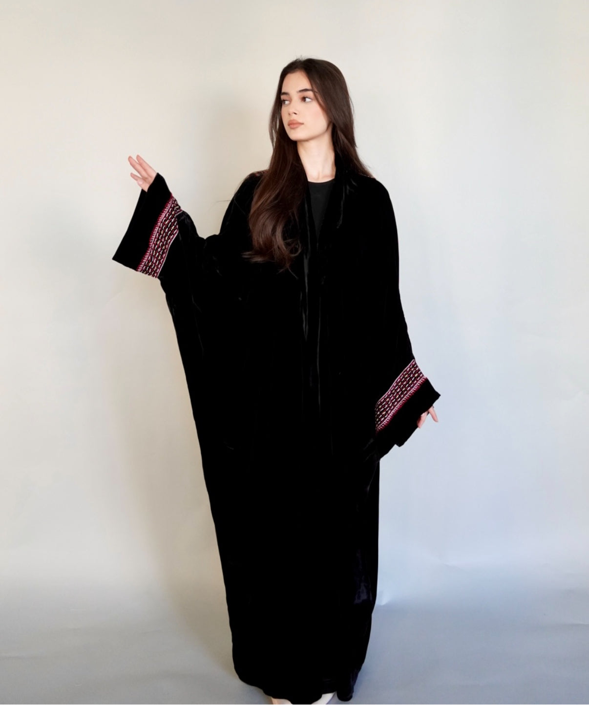 - Black velvet abaya with elegant embroidery.