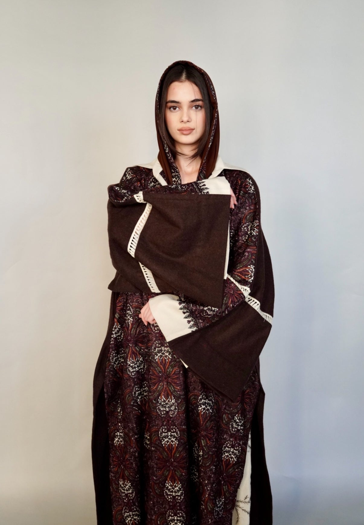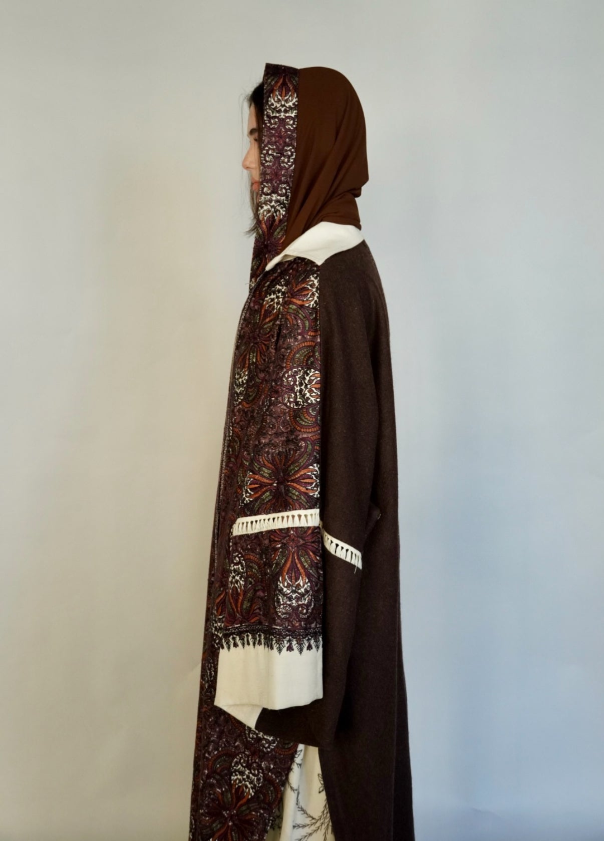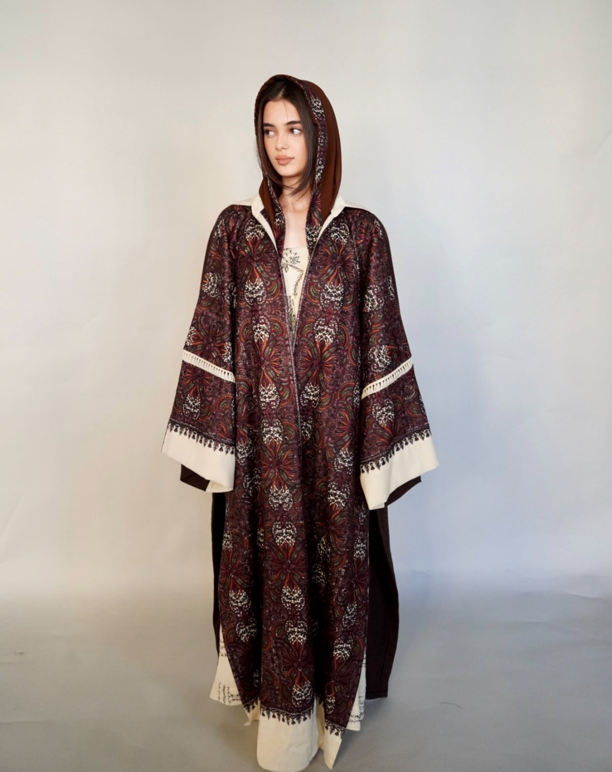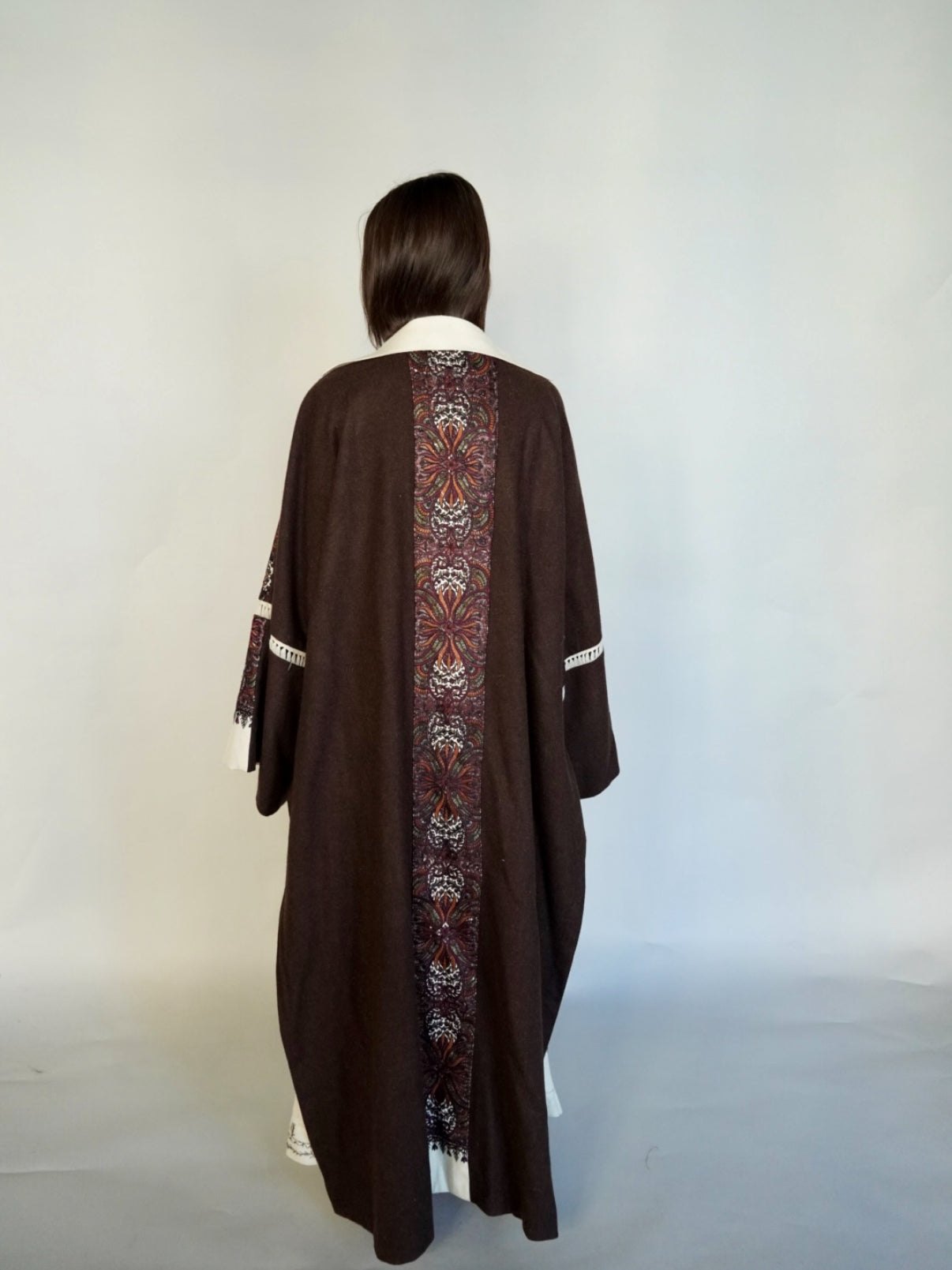 - Maroon randomly embroidered cashmere wool abaya.