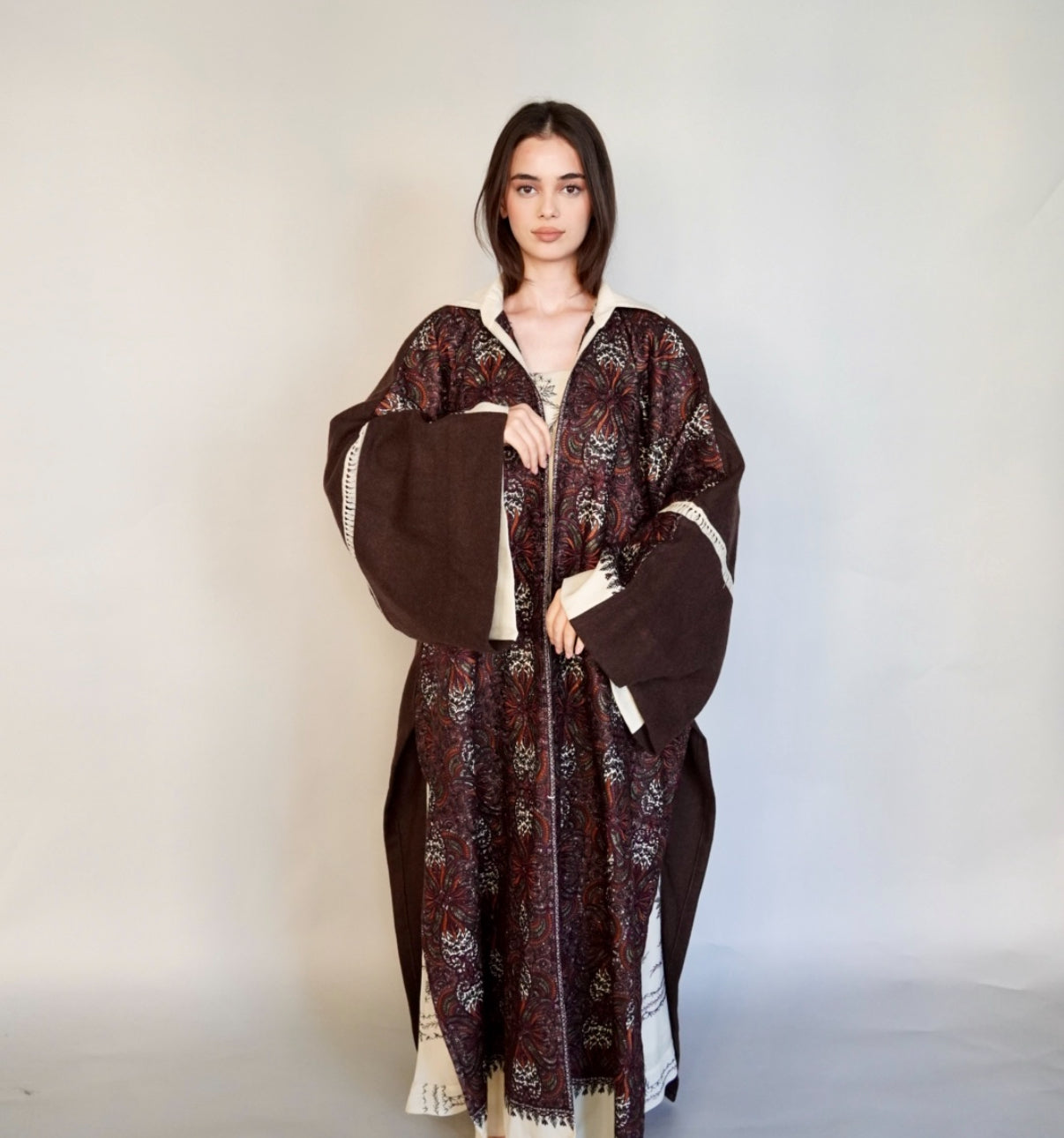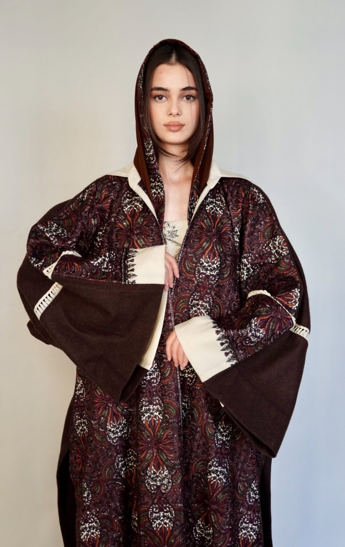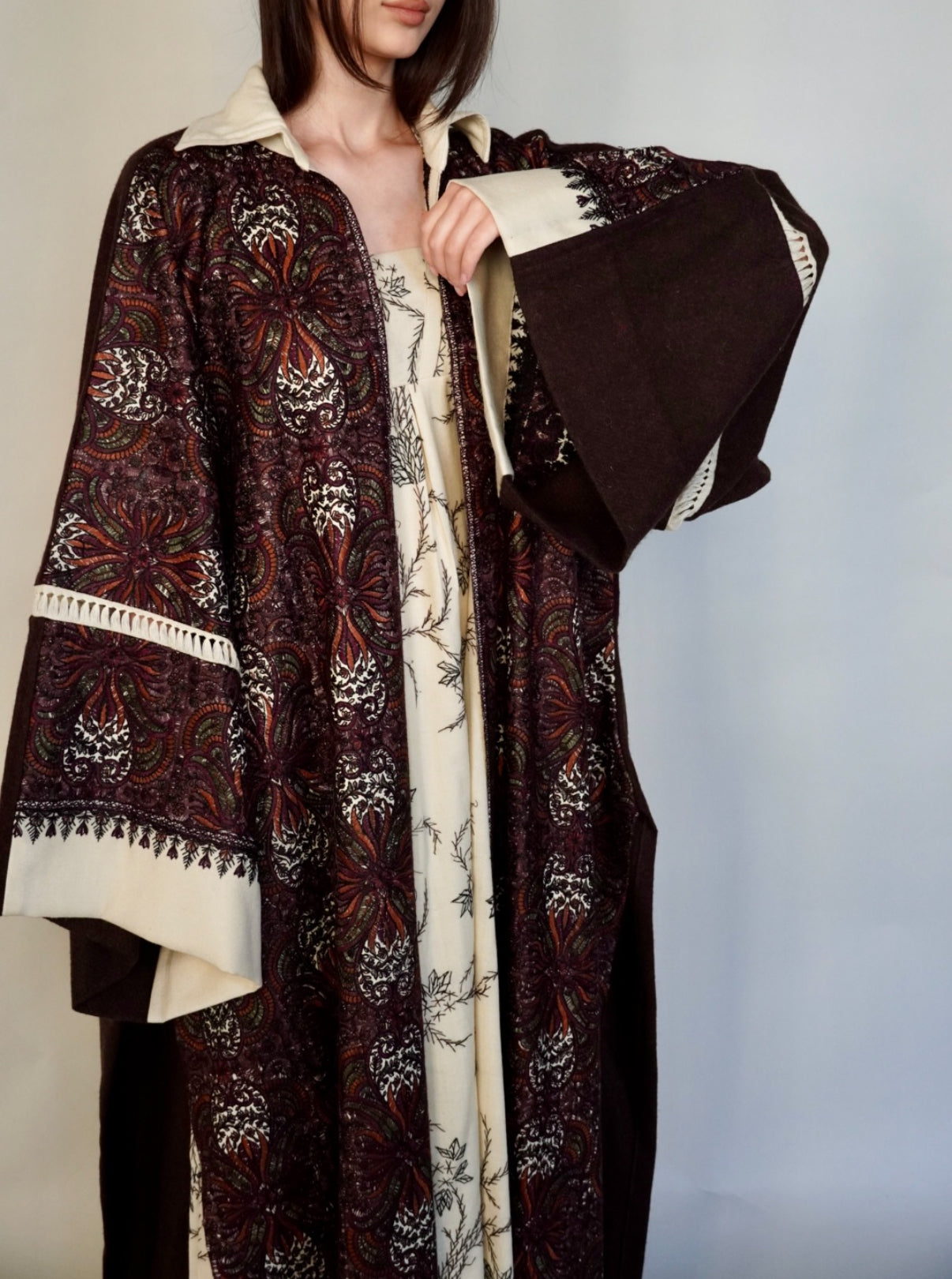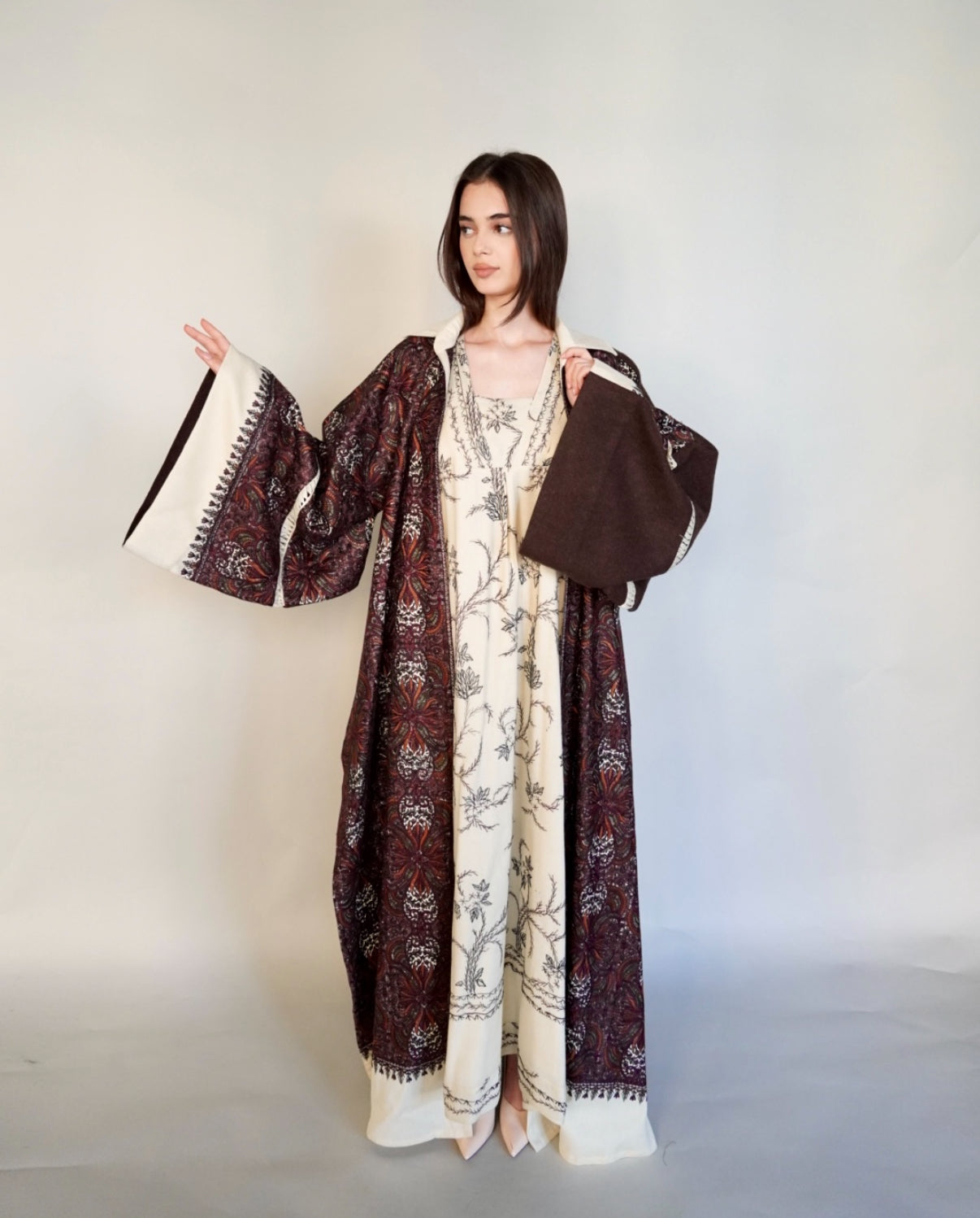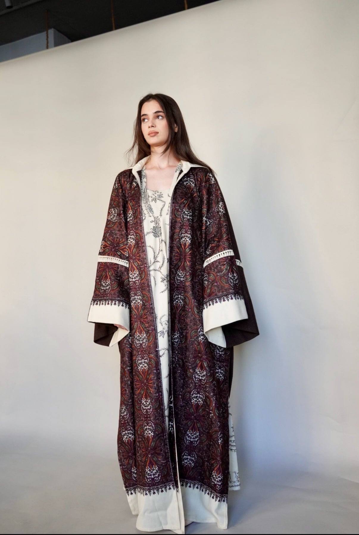- Maroon randomly embroidered cashmere wool abaya.